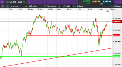 The UK 100 called to open +2 points at 8,349. The UK 100 looks set to open marginally higher this morning, having continued to gain momentum during a strong showing yesterday. Retail sales volumes climbed as expected by 0.5% in July, following a 0.9% drop a month earlier, the Office for National Statistics reported on Friday.
