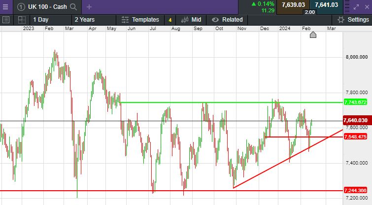 The UK 100 called to open +42 points at 7,639. The UK 100 looks set to open higher this morning as retail sales data this morning showed the largest monthly rise since April 2021. Stateside yesterday saw the S&P close at a new record high, as all three major indexes ended Thursday’s trading session in positive territory, after clawing back the losses suffered earlier in the week. This marks the 11th record high that the 500-stock benchmark has seen so far this year. The broad stock index climbed 0.58%, settling at 5,029.73, while the Nasdaq added 0.30% to close at 15,906.17. The Dow Jones traded 348.85 points higher, or 0.91%, to end at 38,773.12.