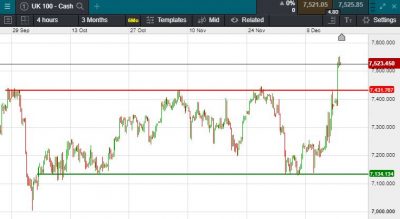 UK 100 called to open +7 points at 7526; This is on the back of yesterday’s 2%+ gain we saw on the UK blue chip index, following further positive sentiment on the back of Fridays general election result, secured certainly if nothing else for investors.  UK PM Boris Johnson has now said he will change law to guarantee the Brexit transition phase is not extended, setting up a new cliff-edge for a no-deal split with the EU at the end of next year, will this provide further investor certainty? If so could this provide a further leg up?  Positive sentiment wasn’t reserved exclusively for the UK yesterday though, the U.S saw all three major indices once again strike all time highs during trading, the Dow Jones closing at 28,235 (+100 points), the S&P closing at 3,191 (+23 points) and the Nasdaq closing at 8,814 (+80 points).  But the green sweep didn’t finish there....trading was buoyant in Asia also, the Nikkei closing at 24,070 (+118 points) and the Hang Seng at 27,813 (+305 points).  The positive trade was driven by further news of U.S - China trade deal edging ever closer to the finish line.  Oil crept ever higher overnight, trading at $65.7 per barrel at time of writing.  Whilst somewhat unexpectedly gold maintained its level of $1477 in spite if risk on being prevalent.