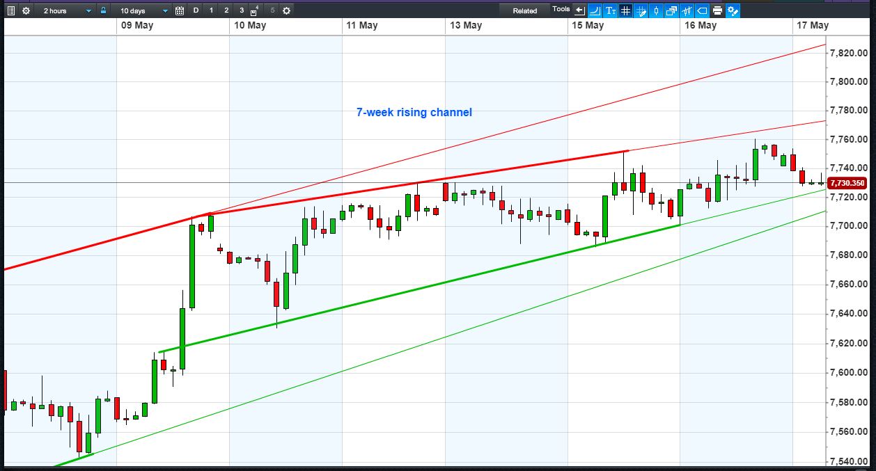 UK 100 Index called to open -10pts at 7725, off its Wednesday high of 7760, though still within a 7-week rising channel. Bulls need a break above 7740 to move back into its latest narrower channel’s upper half; Bears require a breach of 5-day rising support at 7720 to test the floor of the rising channel at 7710. Watch levels: Bullish 7740, Bearish 7710