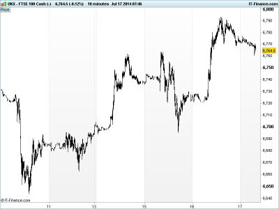 UK 100 called to open -20pts at 6765, despite moderate gains taking US markets to new records helped by corporate results (especially banks), more deal talk, optimism that US monetary policy will stay accommodative and despite some mixed US economic data (housing and inflation beat, production missed).