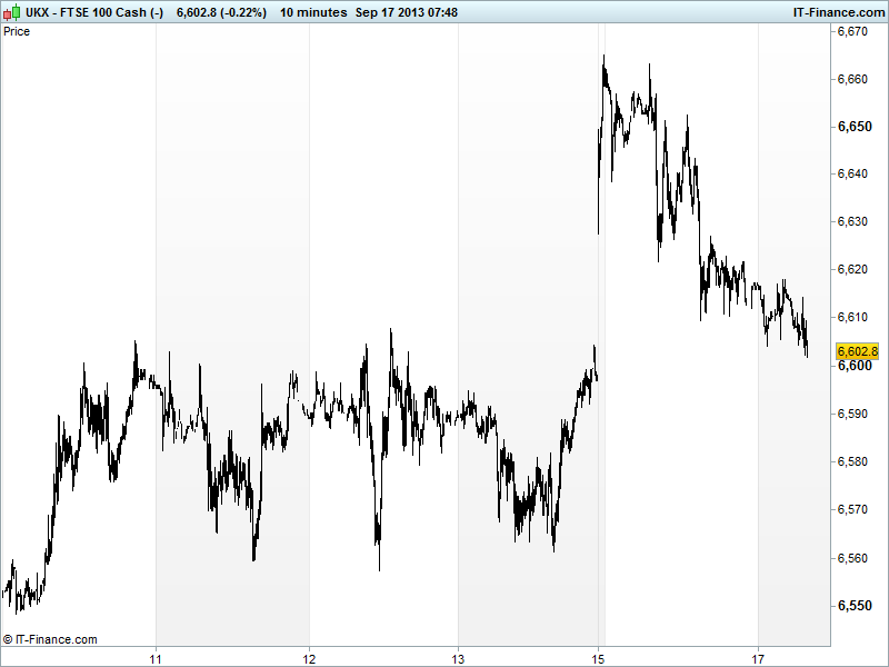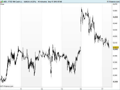 UK 100 called to open -15pts this morning at 6610, with Asian equities lower (Japan back after holiday) despite a positive US close as market participants position themselves ahead of the Federal Reserve update on Wednesday from which tapering of QE3 is widely anticipated (consensus $10bn), although it could be less ($5bn) - a token gesture to maintain credibility.