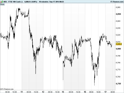 UK 100 called to open +15pts at 6810 having recovered from another test of recent lows in the 6750 zone engineered by some weak macro data and jitters ahead of key risk events later this week including this evening’s policy update from the US Fed FOMC, tomorrow’s ECB offering of TLTROs to banks to boost Eurozone growth and of course the Scottish referendum result on Friday morning.