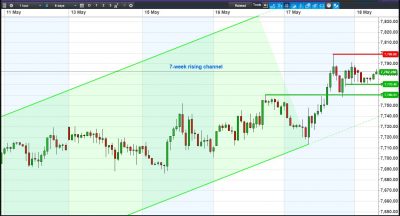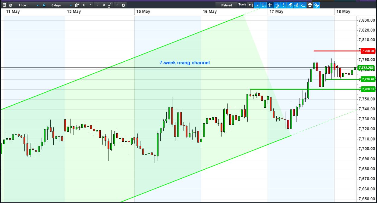 UK 100 Index called to open flat at 7785, back from a re-test of January’s 7800 all-time high but still holding its 7-week up-channel, albeit in the lower half. Bulls need a break above 7800 to open the door for a rally towards intersecting rising resistance (7wk and 4.5yr) at 7885. Bears require a breach of 7770 overnight lows before a fall back to 7-week channel floor at 7740. Watch levels: Bullish 7800, Bearish 7770
