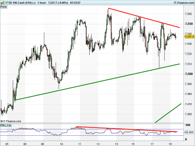 UK 100 Index called to open +20pts at 7535, after another bounce, but still held back by falling highs since last Thursday’s 7565 peak. Bulls continue to believe in the this 7510-7550 range being consolidation of the 5% rally from 7200. Bears are looking for any signs of the index topping out, noting falling highs on the RSI. Bulls need a break above 7545. Bears want another test of recent lows around 7510. Watch levels: Bullish 7545, Bearish 7530.