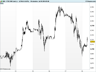 UK 100 called to open -20pts at 6715, having recovered from overnight lows of 6686 after US stocks fell sharply in response to the heightened geopolitical concerns following the air disaster in Eastern Ukraine, compounded by the Israeli ground offensive of Gaza and a White House lock-down due to a suspicious package.