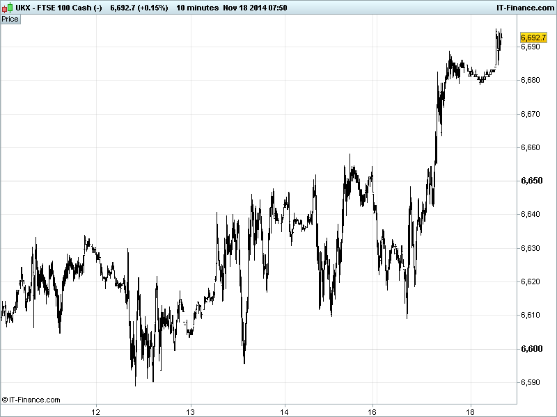 UK 100 Index called to open +25pts at 6695, looking set for a test of 6700 and still benefiting from an ECB tag-team effort from Praet and ECB President Draghi with the former saying if oil price falls led to deflation, then impetus for ECB to act and the latter explicitly saying asset purchases ‘could’ include government bonds (QwhooppeE!) and some big M&A boosting confidence (Halliburton-Baker Hughes, Activis-Allergan).