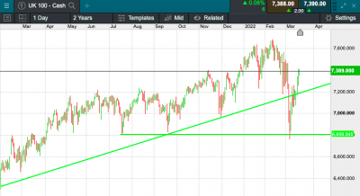 The UK 100 is called to open +6 points today at 7391.  The UK 100 looks set to move cautiously higher this morning after another positive day yesterday following the BoE rate hike.  On Wall Street Yesterday The Dow Jones jumped 418 points to end at 34,481 and the S&P 500 advanced 54 points to 4,412 yesterday as US investors continued to react to the Federal Reserve’s decision to hike interest rates.  In Asia this morning, it has been a mixed session, Japan’s Nikkei rose 182 points, trading at 26,835 after the Bank of Japan left its reference interest rate unchanged but Hong Kong’s Hang Seng index is 100 points lower at 21,401.