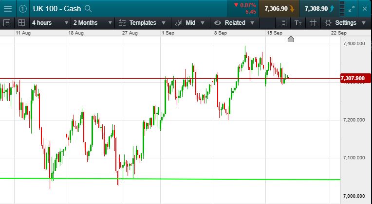 UK 100 Called to open down 10 points at 7310; This comes on the back of a positive trading session stateside seeing an all green board at close of US bourses. Although modest gains, further evidence of positive investor sentiment.   It was a mixed session in Asia with the Nikkei closing negative (Albeit on -.18%) and the Hang Seng more positive (But only by 1 point).  In focus today will be oil prices and oil miners after Saudi Arabia restored almost half the output lost at the Abqaiq plant, which is processing about 2 million barrels a day. The facility will return to pre-attack levels by the end of the month.  Also in focus will be the FED interest rate decision today where the Fed are set to cut rates and prepare for a second cash blast.  Oil retraced from Sunday nights highs once more to settle at $65 a barrel.  Gold found support above $1500 once more.