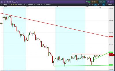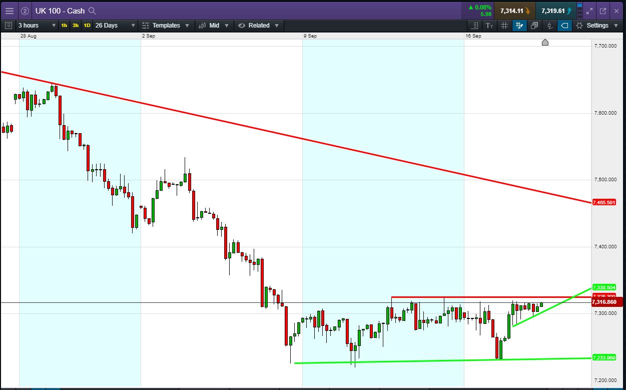 UK 100 Index called to open +10pts at 7310, continuing to knock at the ceiling of a 9-day sideways channel. Bulls need a break above the 7325 channel ceiling. Bears require a breach of rising suport around 7300. Watch levels: Bullish 7325, Bearish 7300