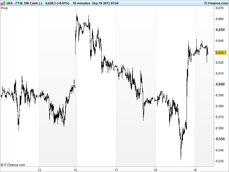 UK 100 called to open +80pts this morning at 6630, back up above the week’s falling highs and longer-term falling trendline since May, thanks to US Federal Reserve surprising markets by not tapering its $85bn QE3 as consensus expected.