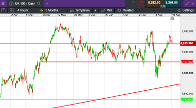 The UK 100 called to open -31 points at 8,280. The UK 100 looks set to open slightly lower this morning, the drop comes off strong week for global markets last week as stocks rebounded from the Nikkei led drop in early August.