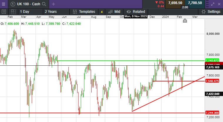 The UK 100 called to open -11 points at 7,700.  The UK 100 is called marginally lower ahead of the open today with US markets closed for the day for the Presidents day holiday.  This comes after a strong session for the UK blue chip index on Friday, which saw a three-figure increase.  In Asia, this morning, the Hang Seng index was 0.9% lower but the Shanghai Composite has reopened following the new year holiday with an improvement of 1.6%.