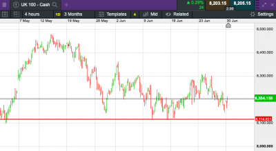 The UK 100 called to open +38 points at 8,202. The UK 100 looks set to open higher today as energy bills look set to fall in the UK to 2 year lows. In Asia this morning were broadly flat as caution was shown towards news in France that Marine Le Pen's national rally took 33.1% of the votes in the first round of parlimentary elections, Macron's party taking just 20%.