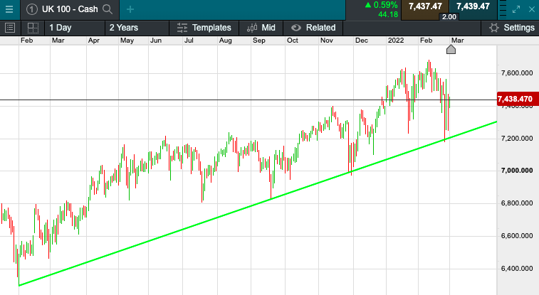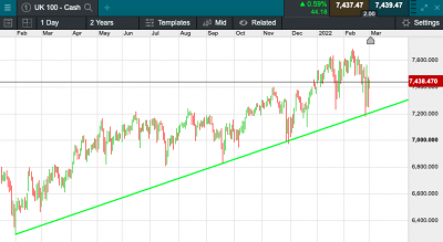 The UK 100 is called to open -8 points today at 7450.  The UK 100 looks set for a steady start today in comparison to other recent sessions, this comes as markets globally picked up overnight despite the shock from the heavy sanctions imposed on Russia.  US markets closed higher and Asian markets also improved during the day.