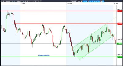 UK 100 Index called to open -60pts at 7575, having broken down from last week’s rising 7500-7700 channel, opening the door for another revisit of April lows support. Bulls need a break back above 7600; Bears require a breach of 7570. Watch levels: Bullish 7600, Bearish 7570