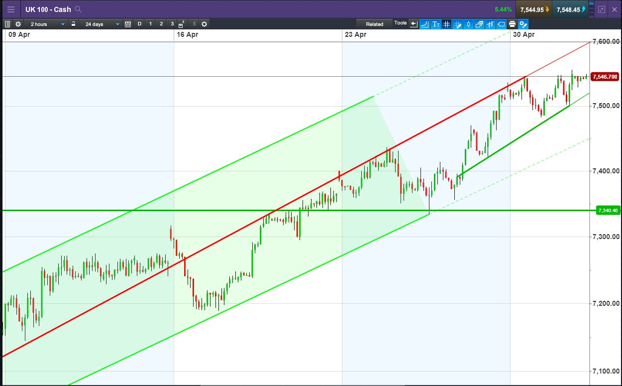 UK 100 Index called to open +25pts at 7545, still knocking at this week's highs to keep the up channel - albeit now narrower - in tact, with rising support at 7520 and then 7450. Bulls need a break above 7555 overnight highs. Bears require a breach of 7520 rising support. Watch levels: Bullish 7555, Bearish 7520.