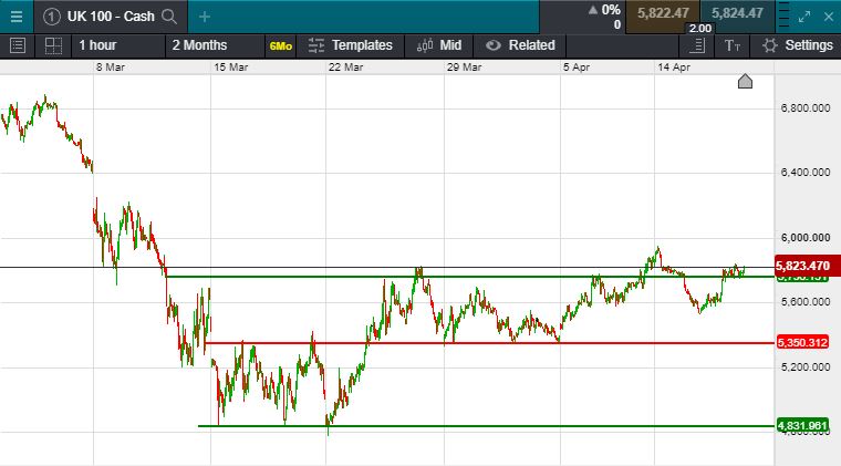 UK 100 called to open +37 points points at 5823.   A positive opening call for the week as investors add more credence to hopes over drug trials due for this week for the coronavirus, this positive sentiment comes inspite of crude oil sagging to the lowest since 1999 after China's first-quarter contraction clouded the demand outlook. The drop was exacerbated by tomorrow's expiration of the May dated oil contracts. Meanwhile, New York appeared to be "on the other side" of the outbreak, and Spain, France and the U.K. reported the fewest fatalities in weeks.  In Asia it was a mixed session, seeing the Nikkei falling 1.15% to trade at 19,669, the Hang Seng closing flat to trade at 24,352 and the Chinese CSI also closing flat to trade at 3,846.