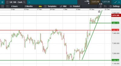 UK 100 called to open flat at 7574; Following yesterday’s resilience shown in global equity markets on the back of Donald Trump’s impeachment. U.S Markets even went as far as to strike all time new highs across its three major indices, The Dow Jones closed at 28,376 (+137 points), the S&P 500 closed at 3,205 (+14 points) and was the Nasdaq ending the penultimate trading session of the week at 8,887 (+60 points). It was a more mixed session in Asia, the Nikkei closed within 0.1% of opening price, at, 23,845 (-19 points), whilst the Hang Seng closed in the green at 27,849 (+50 points). News that Andrew Bailey will be the BOE's post-Brexit chief, the FT reported. Mark Carney's successor spent three decades at the central bank before moving to run the Financial Conduct Authority will be of interest to traders of pound sensitive stocks, could this be the piece of the puzzle that see’s enough certainty to strengthen the pound? Also in focus today will be Boris Johnson’s Brexit bill faces its first vote Friday in the House of Commons as the prime minister seeks to drive the legislation through Parliament and take the U.K. out of the European Union on Jan. 31. Overnight oil edged ever higher, at one point breaking through the $67 handle to trade just shy at time of writing at $66.92. Gold added $2 overnight to break above the $1477 level, trading at time of writing at $1479.