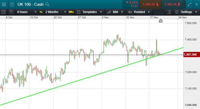 UK 100 called to open -15 points at 7308; A negative open is seen after the US through fuel on the tinderbox trade situation by drawing China's ire after the Senate unanimously passed a bill supporting protesters in Hong Kong warning against a violent suppression. This lead to a risk off appetite in Asian trading seeing the Nikkei -144 points (-0.62%), & the Hang Seng -208 points (-0.77%). Trading in the US was also muted as the Dow closed -102 points (-0.36%) & The S&P -1.85 points (-0.06%). The Nasdaq however bucked this trend by closing +20 points (+0.24%). Oil slipped overnight to sit at $60.9. The big winner was gold, rising from $1474.