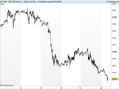 UK 100 called to open -35pts at 6430, as the correction persists with the market pricing in a September tapering of QE3 by the US Federal Reserve, with both US and Asian bourses in the red and both developed and emerging markets (equities, bonds and FX) being shaken aggressively.