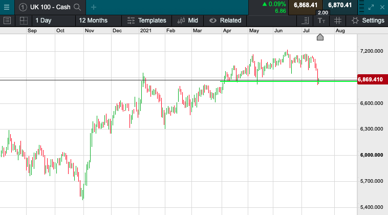 The UK 100 is called to open +26 points today at 6870.  The UK blue chip index is expected to rebound slightly following yesterday sell off, which wiped $44bn off the value of the index, reaching its lowest levels for 3 months as growing fears the spreading Delta variant of the coronavirus harming the global economic recovery sent assets, including oil, falling sharply. It was a similar fate on Wall Street also suffered a difficult session, with the Dow Jones leading the fall, with a 2.1% drop, the worst one day fall since October, while the S&P 500 slid 1.6% and the Nasdaq 1.1%. In Asia this morning the trend continued, Japan’s Nikkei hit a six-month low in early trade before recovering a bit and trade 0.7% lower. The Hang Seng traded lower, slipping 1.1% , while China’s Shanghai Composite was 0.4% lower.