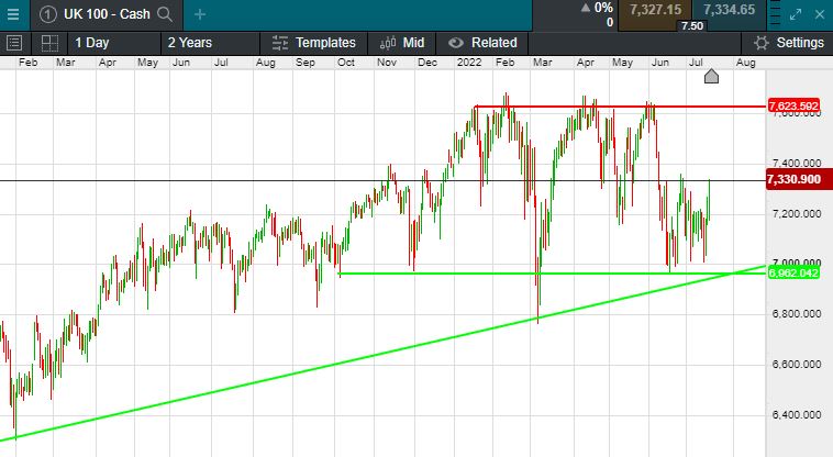 The UK 100 is called to open +37 points this morning at 7331.  The UK 100 looks set to see good early gains despite UK inflation data hitting 9.6% this morning, a 40 year high as Wall St jumped on the back of reassuring trading statements from several US household names.  The S&P and Nasdaq had their best days since end June as Halliburton and Hasbro beat forecasts as did IBM though it cautioned about the impact of the strong dollar.  But FAANG member Netflix was the standout performer with the shares up 8% after hours.  The Dow Jones jumped 754.44 points, or 2.43%, to 31,827.05, closing near the highs of the session as gains accelerated in the final hour of trading. The S&P gained 2.76% to 3,936.69. The Nasdaq Composite rose 3.11% to 11,713.15.  All three major averages are above their 50-day moving averages for the first time since April. The broader market index has gained almost 7.4% off its June 16 closing low.