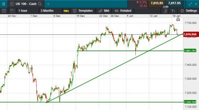 UK 100 called to open -40 points at 7611; Stocks and U.S. futures dropped in Asian trading Tuesday, with Hong Kong equities falling more than 2%. The yen and U.S. Treasuries advanced as a broad risk-off move developed, with gold edging higher. China’s yuan weakened by the most in three months. Market participants attributed the moves to worries over China’s coronavirus. The Nikkei fell 218 points to settle at 23,864, while the Hang Seng closed at 27,994 (-801 points). US markets were closed yesterday due to bank holiday for Martin Luther King day. Crude oil also saw a slight pullback to trade at $65 at time of writing, while as previously mentioned gold was the biggest gainer, trading at $1564.