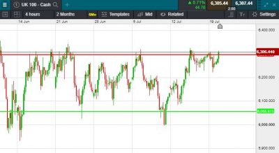 UK 100 called to open +50 points this morning at 6306. Calls for a positive open come as European leaders reached agreement on a €750bn pandemic recovery fund. This follows yesterdays bounce back rally, seeing the Dow Jones close the day 22 points higher at 26,694 having spent the majority of the day in the doldrums, driven higher as earnings season continued with strong numbers from tech stocks Microsoft who closed out the day 4.29% higher and Tesla who closed out the session at fresh record highs 9.47% higher. This paired with the The S&P 500 rising 19 points, or 0.6%, to 3,243 & the Nasdaq gaining 226 points, or 2.2%, to 10,729, completed an all green day stateside.