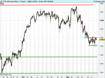 UK 100 Index called to open flat at 7390 having held sideways 7385-7400 since yesterday afternoon. Bulls hope this is a in preparation for a breakout above the bugbear 7400 level. Bears are angling for a breach of 7380, for a retrace to 7340. Watch levels: Bullish 7405, Bearish 7380