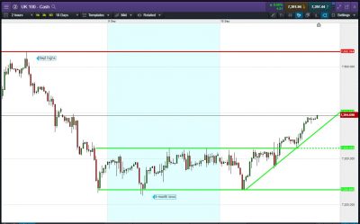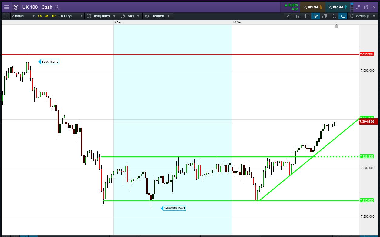 Closer to home, UK public finances (9:30am) are once again projected to fall back to a deficit after an August surplus following seasonal tax receipts. The Bank of England (BoE) also publishes its Q3 Quarterly Bulletin (12pm) discussing price stability and monetary operations as well as market developments like trade and Brexit. Could impact GBP with a knock-on for the UK Index .