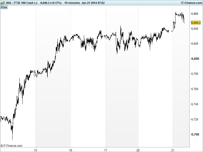 UK 100 called to open +15pts at 6850, as 2014 market optimism gets a fillip from China’s central bank PBOC intervening in the money markets to cool the squeeze in interbank-lending lending/borrowing rates which had moved up in repose to the seasonal New Year cash drawdown by the public. Remember though, China still trying to rein in lax lending due to risk of defaults.