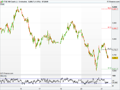 UK 100 Index called to open +10pts at 5684 with an impressive 180pt overnight rally from new 2-yr lows and round number 5600 yet again selling off. With the index having briefly broken below the floor of its falling channel and failing to hit the ceiling on the bounce, there is potential for the downtrend to steepen, while another bounce likely to find resistance at or near 6000. The 100-day MA just looks miles away. ‘Sell any rally’...! Watch levels: Bullish 5935, Bearish 5590.