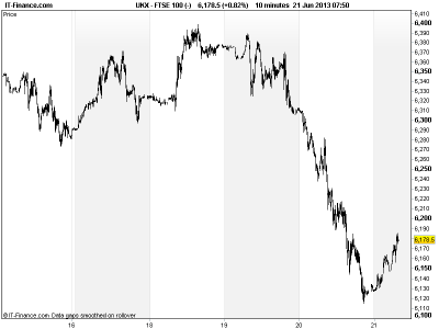 UK 100 called to open +45pts at 6175, off their worst levels having tested the highs of May 2011 after a another bout of painful indigestion/heartburn regarding the US Federal Reserve’s view that current momentum in US macro data ‘could’ (much emphasis needed - all dependent on improving data) allow QE3 tapering by year-end and withdrawal of the stimulus drip next year.