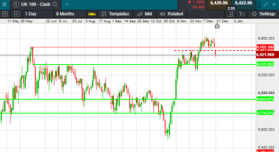 UK 100 called to open -100 points this morning at 6421. A sharply lower open is expected today amid concerns over a prolonged winter lockdown aimed at protecting the population against a new super-strain of the coronavirus. The problems look to have been compounded by a ban on travel to at least 10 countries in mainland Europe and a halt to cross-Channel freight transport. Sentiment on Asia’s main markets overnight, meanwhile, was hit by a surge in Covid cases across the region with only Shanghai bucking the trend.