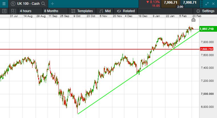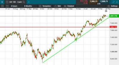The UK 100 called to open -17 points at 7997. The UK 100 looks set to open on the back foot ahead of the latest UK borrowing numbers and a raft of PMI figures. The US will reopen today after yesterday’s Presidents Day bank holiday. Data this morning, showed Public borrowing in the UK, year to date is £30.6bn less than predicted by the Office for Budget Responsibility (OBR).