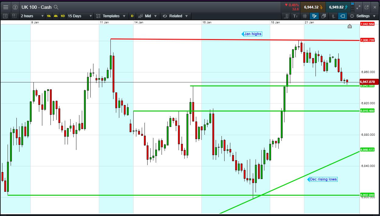 UK 100 called to open -25pts at 6945, back from a flirt with 7000, retracing Friday’s 6940 breakout, but for now holding the level. Bulls need a break above 6960 while Bears require a breach of 6940. Watch levels: Bullish 6960, Bearish 6940