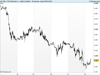 UK 100 called to open -5pts at 6385, after US and Asian equities took another leg lower following publication of the Fed’s July FOMC minutes which offered little to counter recent anxiety regarding QE3 tapering by year-end, even if market expectations for September could be pushed out a touch after some more mixed data prints since and some Fed members calling for patience.