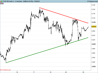 UK 100 Index called to open +40pts at 6073 after yesterday’s early morning rally yet again got retraced later in the day, courtesy of what can only be described as a textbook multiple top reversal (five tops, to be precise!). Overnight rising lows are encouraging, while potential falling resistance around 6095/7000 levels could stifle gains. Watch levels: Bullish 6120, Bearish 6020.