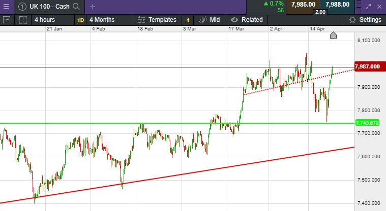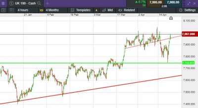 The UK 100 called to open +97 points at 7,982. The UK 100 looks set to open higher this morning, continuing the momentum showed on Friday afternoon as tensions between Iran and Israel appear to have momentarily simmered down.  On Wall Street Friday, the tech-heavy Nasdaq pulled back 2.05% to 15,282.01, while the broad S&P slipped 0.88% to 4,967.23, below the 5,000 level. Both clinched their sixth straight negative days, streaks not seen for either since October 2022.  The Dow Jones rose 211.02 points, or 0.56%, to finish at 37,986.40. The 30-stock index was lifted by a rally of more than 6% in American Express following earnings.