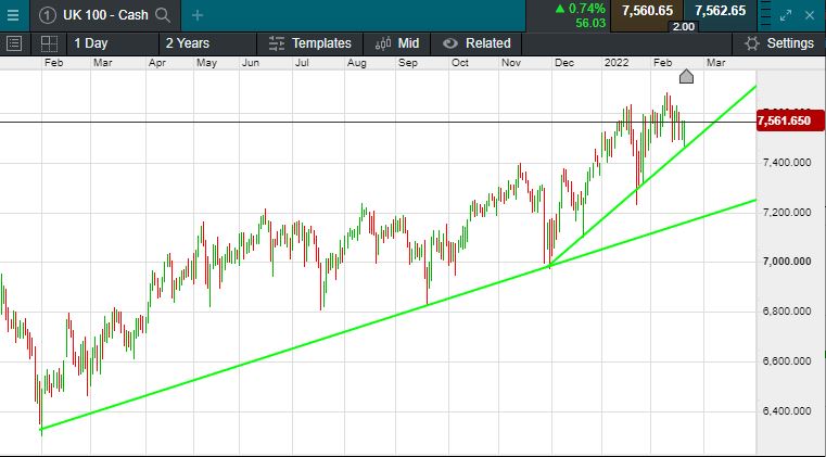 The UK 100 is called to open -110 points today at 7374.  The UK 100 is expected to open sharply lower as Russia ordered its troops into two rebel states in eastern Ukraine and recognised their independence. Us futures are significantly lower following the bank holiday closure of markets yesterday for Presidents’ Day.  The Dow Jones were down by 542 points, or 1.59%. S&P futures slid 1.83%, and Nasdaq futures were off by 2.46%. Asian markets were off this morning also with the Nikkei falling 2%, while the Hang Seng fell by 3%.