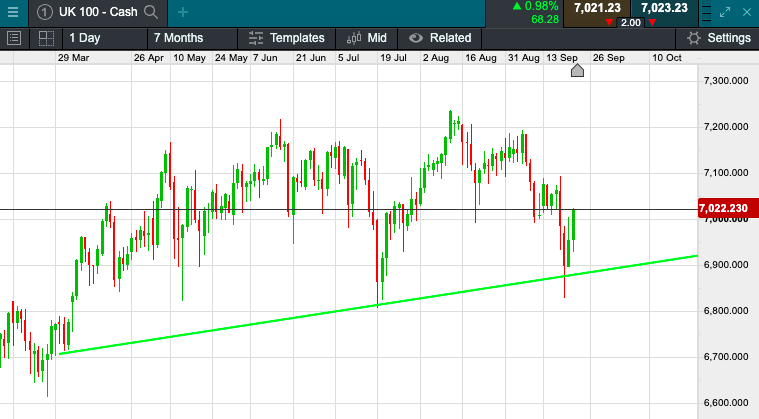 The UK 100 is called to open +42 today at 7022. A positive open is expected today for the UK's Blue chip index ahead of the Fed interest rate decision, even though there are still concerns about China’s Evergrande, But losses were capped after the heavily indebted Chinese property giant said it would make an bond coupon due on Thursday, offering some relief to investors