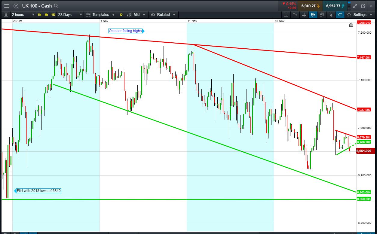 UK 100 Index called to open -10pts at 6950, holding the mid-point on November’s falling channel, but with a bearish pennant breakdown in progress. Bulls need a break above 6985 to overcome the pennant, for a rally back to 7050. Bears require a breach of yesterday’s 6945 lows for further downside within the aforementioned channel, to October’s flirt with 2018 lows. Watch levels: Bullish 6985, Bearish 6945