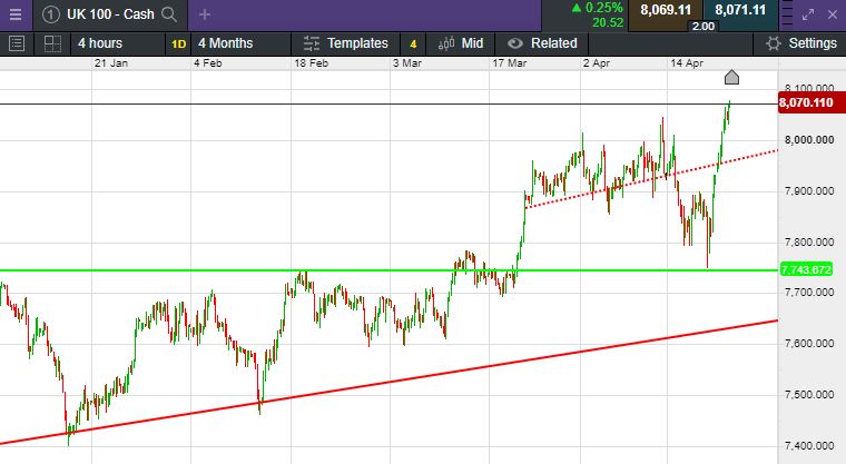The UK 100 called to open +46 points at 8,069.  The UK 100 looks set to open higher once again, smashing through yesterdays fresh all time high, as Middle East tensions appeared to have simmered down for the time being.  Stateside yesterday it was a similarly positive story, The Dow Jones climbed 253.58 points, or 0.67%, to close at 38,239.98. The S&P traded 0.87% higher to finish the session at 5,010.60, while the Nasdaq advanced 1.11% to 15,451.31. Both the S&P 500 and Nasdaq ended a six-day losing streak.