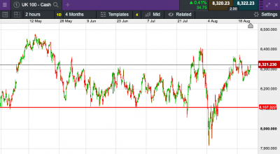The UK 100 called to open +35 points at 8,323. The UK 100 looks set to open higher this morning, after US markets feel sharply yesterday as investors took a more risk off appetite ahead of today’s Jackson Hole speech by Federal Reserve chair Jerome Powell which might deliver clues on how quickly and deeply the Fed may cut interest rates.