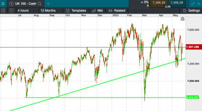 The UK 100 is called to open +75 points this morning at 7464.  The UK 100 looks set to kick off the week in a positive manner, with investors largely ignoring the stuttering start to the week in Asia.   This comes after a mixed session to close out the week on Friday, The S&P finished  the day 0.01% higher to 3,901.36 after falling as much as 2.3% earlier in the session. At the day’s lows, the S&P was 20.9% below its intraday high in January. The index closed about 19% below its record.  The Dow Jones rose 8.77 points to 31,261.90 after being down more than 600 points at the day’s lows. The Nasdaq fell 0.3% and is already deep in bear market territory, 30% off its highs.