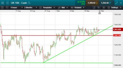 UK 100 called to open +10 points at 7354; this comes on the back of a slightly muted Asian session contributed to in main by furthering geopolitical tensions. In corporate news this morning UK travel firm Thomas Cook has collapsed and filed for bankruptcy, leaving 150,000 passengers stranded.  The Dow Jones having closed last week with a negative trading session has bounced back in out of hours trading to once again settle above 27000, a level which has proven key for the US index.  Oil rose 1% overnight to again break through $65 a barrel, will oil find support here again? As mentioned geopolitical tensions globally are having an impact on global equity markets and the big winner has been gold, now trading above $1515.