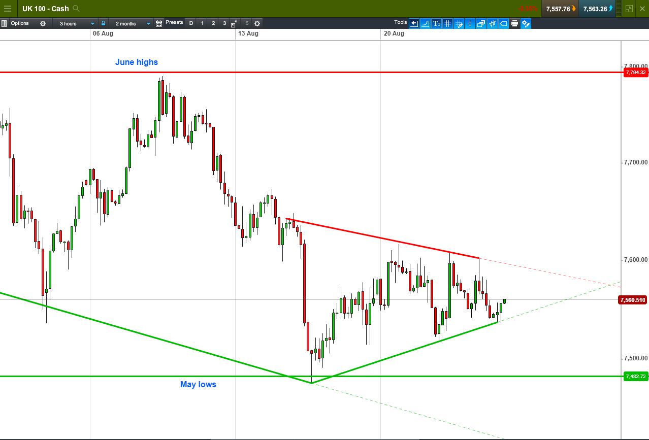 UK 100 Index called to open -10pts at 7552, still trading sideways and looking to end the week’s last session in the same position where it began. Bulls need a break above 7585 to attempt another challenge of 2-week falling highs. Bears require a breach of 7537 rising support. Watch levels: Bullish 7600, Bearish 7518