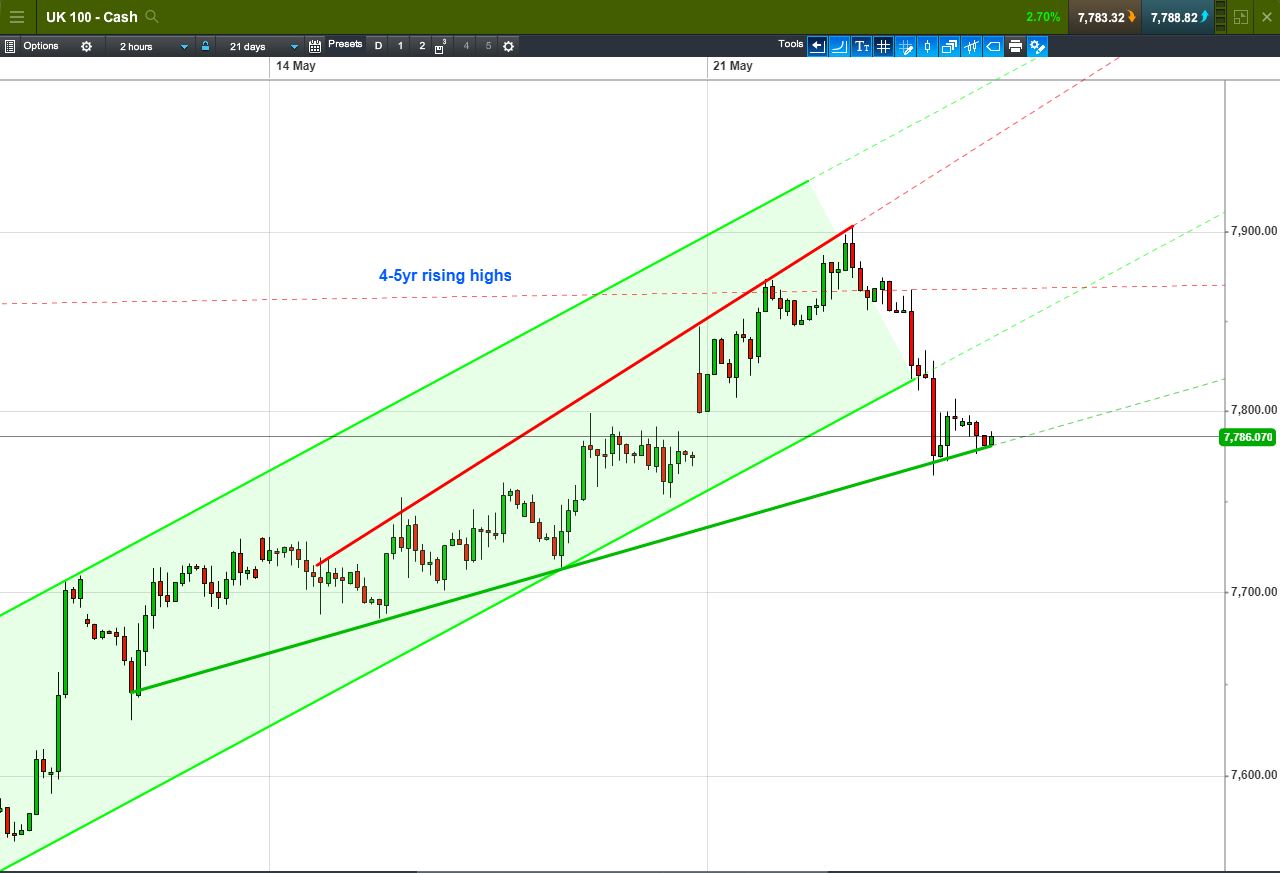 UK 100 Index called to open flat at 7788, within a new 7765-7800 range following yesterday’s breakdown; from an 8-week rising channel, and back below Jan’s 7805 peak. Bulls need a meaningful break above 7800; Bears require a breach of yesterday’s 7765 lows. Watch levels: Bullish 7805, Bearish 7765.
