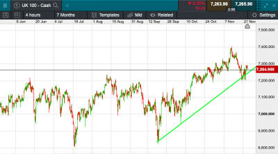 The UK 100 is called to open +10 points today at 7276. A positive open is expected this morning for the UK's bluchip index of stocks ahead of tomorrows bank holiday Stateside for the Thanksgiving holiday.  On Wall Street yesterday, the Dow Jones closed at 35,813, up 194 points or 0.55%, whilst the S&P edged only marginally higher to finish at 4,690. The Nasdaq fell by 0.5%, to end out the day at 15,775, whilst the small-cap Russell 2,000 index lost 0.15% to end the session at 2,327.  Stocks in Asia this morning were mixed on Wednesday as New Zealand's central bank raised its cash rate by 25 basis points to 0.75%.  China’s Shanghai Composite gained 0.14% and Hong Kong’s Hang Seng index rose 0.60%,  The Nikkei in Japan slumped 1.6% while South Korea’s Kospi slipped 0.08%.
